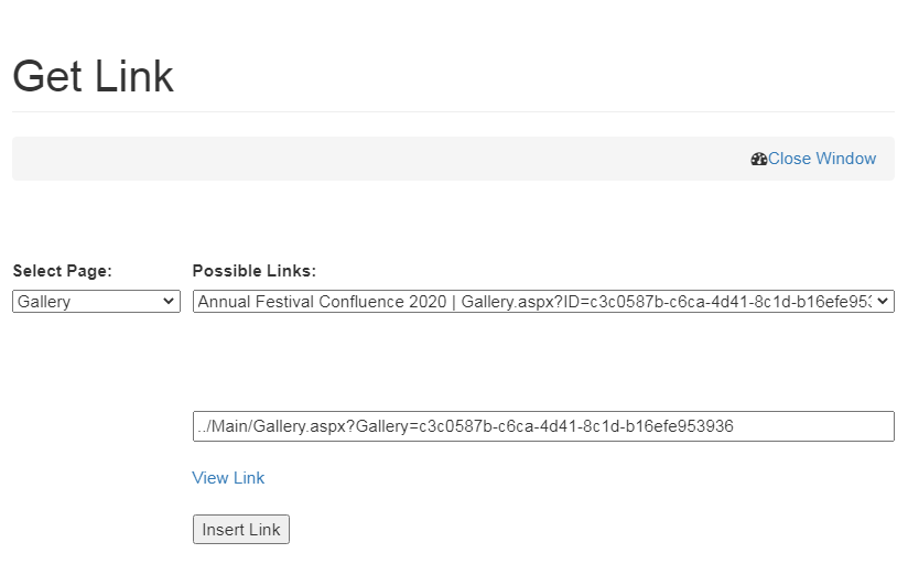 - Click on Get Local link, select Gallery or Gallery List from the select Page drop down menu and click on Insert Link.