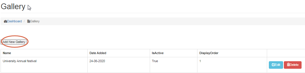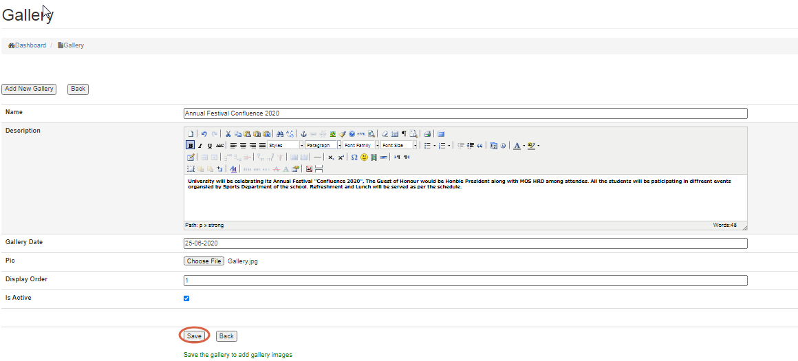 Once all the details are entered, click on Save button to save the newly created Gallery in Photo Gallery Page of the website.