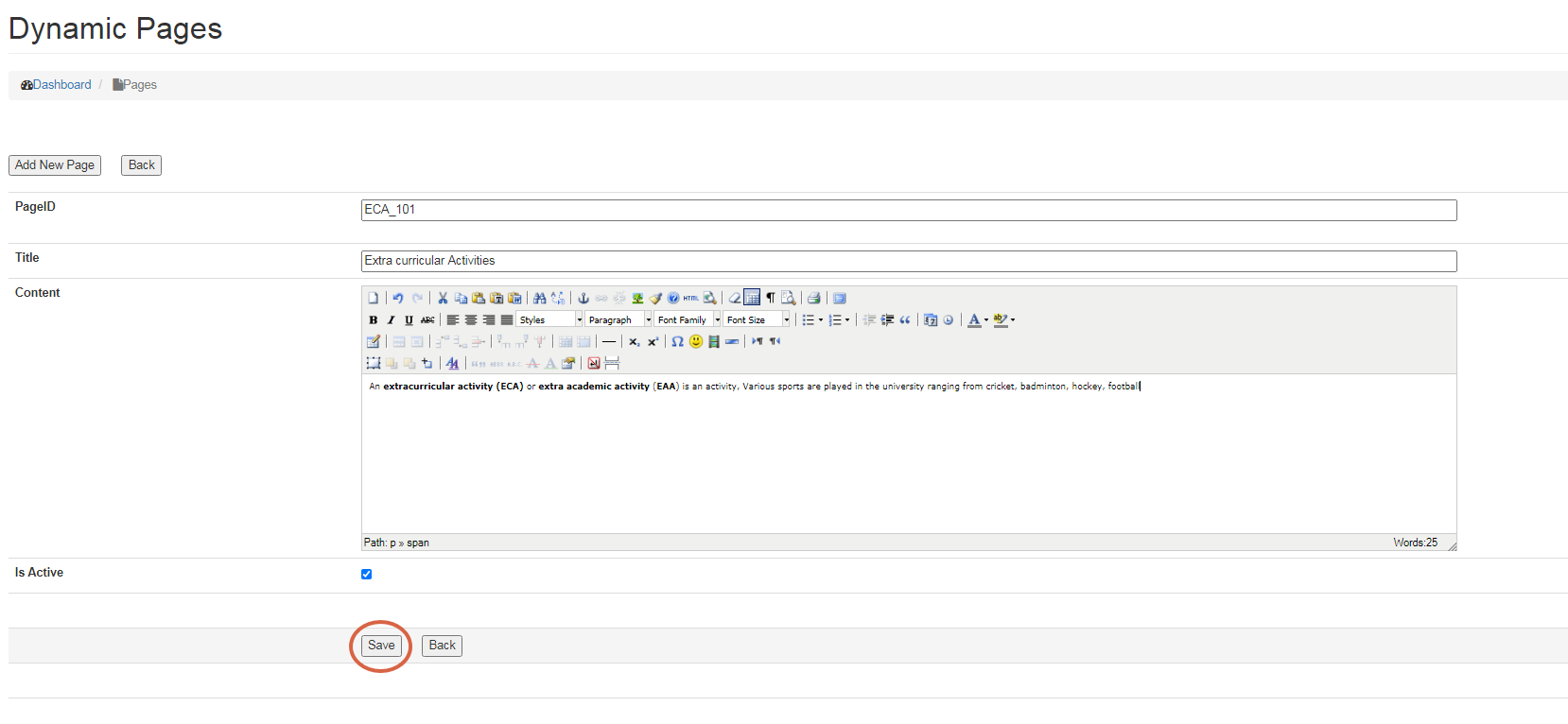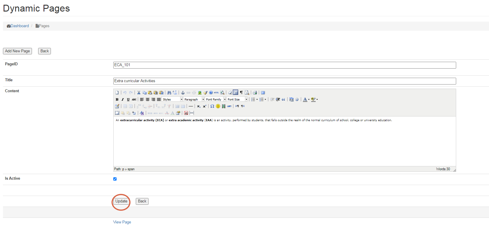 Is Active is used to select whether the Page is to be displayed or kept hidden on the website.