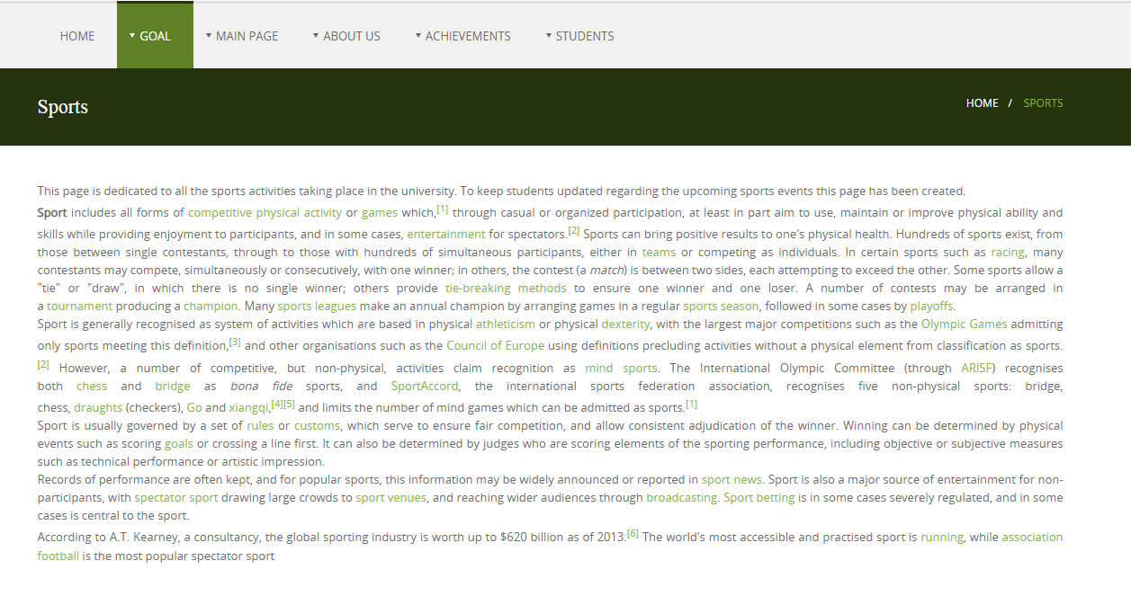 Screenshot of newly added page by the name sports on the website, linked to Main menu.